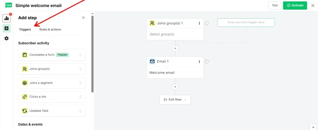Click the Triggers tab on the left side of your screen. Drag a trigger into your workflow. This trigger will start your sequence automatically. For example, you can start the workflow when someone signs up for your newsletter. This step tells MailerLite when to begin the automation.