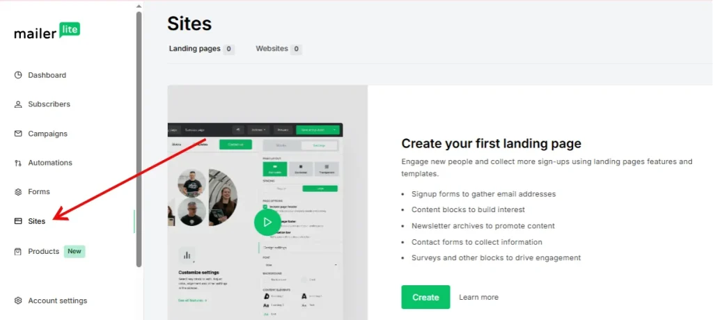 Log in to your account and go to the Sites page from the left menu. This is where all your landing pages and websites stay.