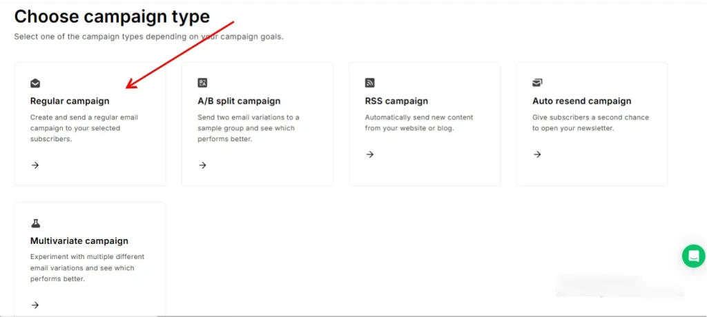 Click the Create campaign button. MailerLite will ask for a campaign name. Use a simple name like “Weekly Tips” or “New Signups.” This name stays internal, so your readers will never see it. Select the campaign type you want to send, such as a regular email.