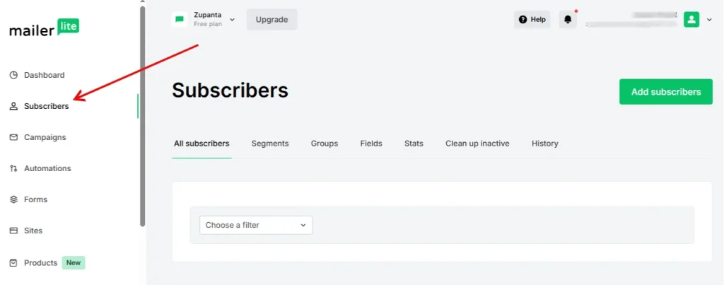 Log in to your MailerLite account. Go to the left menu and click the Subscribers tab. This section shows your list, groups, and growth stats.
