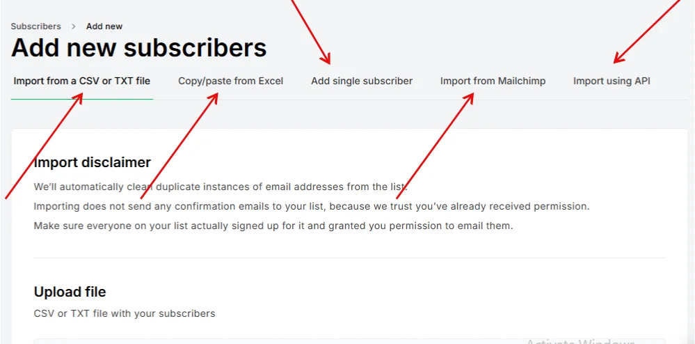 Click the Add subscribers button at the top. This option lets you bring new contacts into your account.