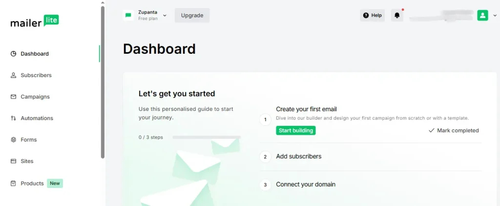 MailerLite Dashboard will be the first thing that you will deal with after the sign-up process. This is the page from where you can access all the features of this platform, like automation, campaigns, subscribers, and forms.