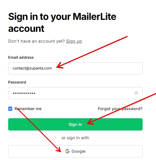 Now your registration with MailerLite is completed, and you need to log in to your MailerLite account. Just enter your email and password to get inside the dashboard.