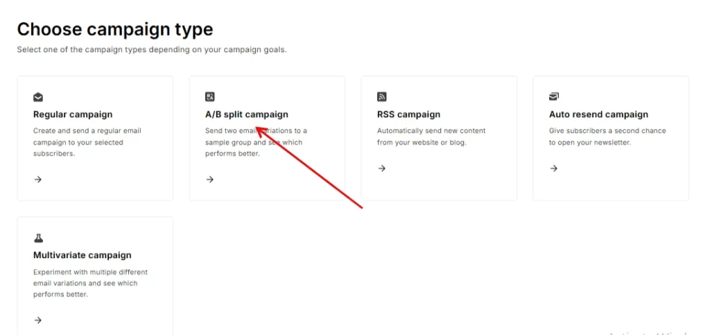 - Now look for the “Type” option and then choose “A/B Split Campaign” under this menu.