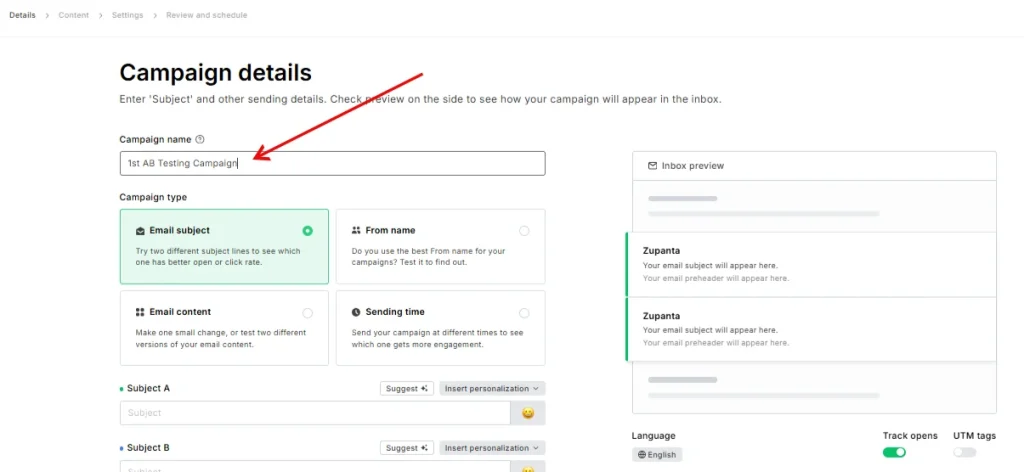 - Choose a name for your campaign under the Campaign details section. Also, choose the type of test you need to do, like Form name, Email Subject, or Email content.