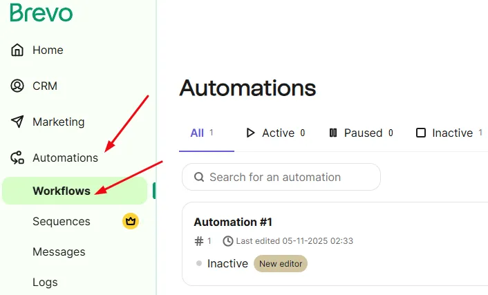 Sign in to your Brevo account and look for “Automations” on your left sidebar. Open this and now choose “Workflows”.